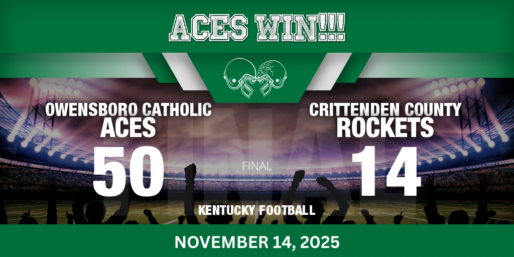 Owensboro Catholic kept its postseason momentum rolling Friday night, overpowering Crittenden County 50–14 in the second round of the Class 2A playoffs at Steele Stadium. The Aces exploded out of the gate with a 22-point first quarter, added 21 more in the second, and built a commanding 43–0 lead before the Rockets could get on the board. By halftime, Catholic led 43–7 and had complete control of the game.